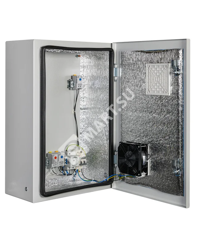 утеплитель из порилекса, замок 2 шт, ключ 1 шт, монтажная плата 1шт, гермовводы 2 шт (MG-25), розетка 1 шт, автоматический выключатель, 6А 1шт, клемма для подключения оборудования 2 шт, клемма заземления 1 шт, термореле 1шт, реле предстарта 1 шт, вентиляционная решётка с фильтром 1 шт, вентилятор с решёткой и фильтром 1 шт, нагреватель мощностью 100 Вт 1шт.