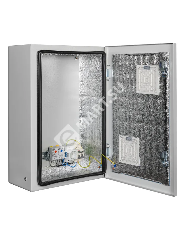 утеплитель из порилекса, замок 2 шт, ключ 1 шт, монтажная плата 1шт, гермовводы 2 шт (MG-25), розетка 1 шт, автоматический выключатель, 6А 1шт, клемма для подключения оборудования 2 шт, клемма заземления 1 шт, термореле 1шт, реле предстарта 1 шт, вентиляционная решётка с фильтром 2 шт, нагреватель мощностью 100 Вт 1шт.