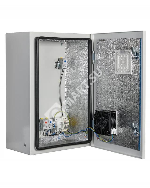 утеплитель из порилекса, замок 2 шт, ключ 1 шт, монтажная плата 1шт, гермовводы 2 шт (MG-25), розетка 1 шт, автоматический выключатель, 6А 1шт, клемма для подключения оборудования 2 шт, клемма заземления 1 шт, термореле 1шт, реле предстарта 1 шт, вентиляционная решётка с фильтром 1 шт, вентилятор с решёткой и фильтром 1 шт, нагреватель мощностью 100 Вт 1шт.