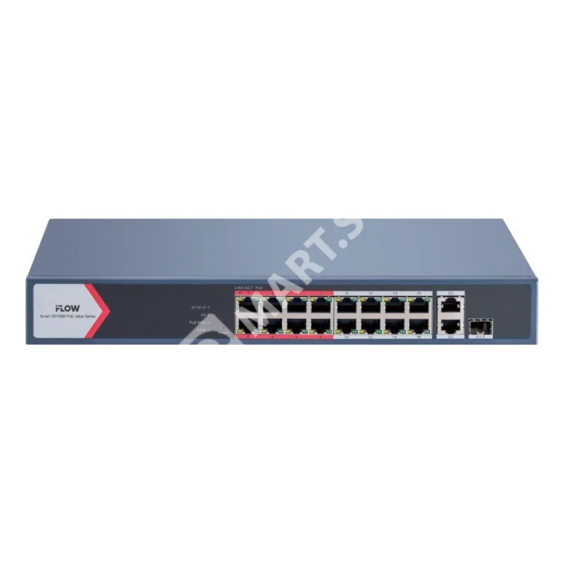 Смарт-управляемый; 16 RJ45 10/100M PoE с грозозащитой 6кВ; 1 1000M комбо-порт, 1 1000М Ethernet порт; 802.3af/at; бюджет PoE 130Вт; поддержка режима передачи до 300м, 10Мб/с, CAT6; пропускная способность 9.2Гб/с; визуализированная топология управления, контроль статуса сети, уведомление тревог в реальном времени, контроль и обзор устройств видеонаблюдения